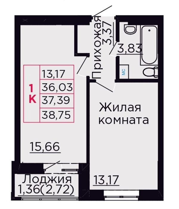 1-комнатная — 37,39 м²