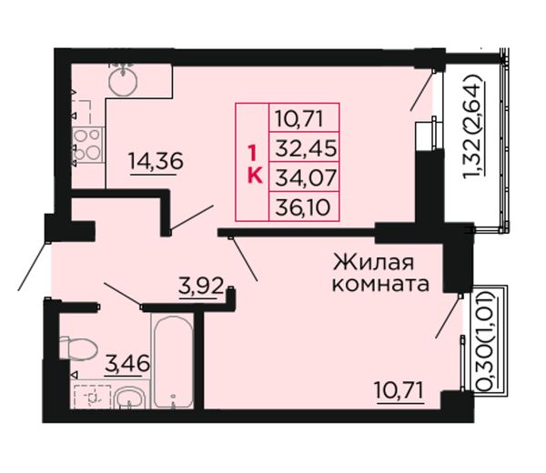 1-комнатная — 34,4 м²
