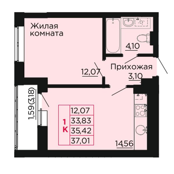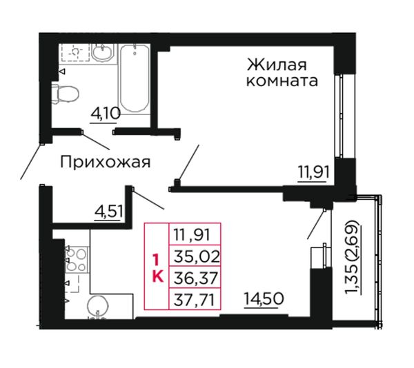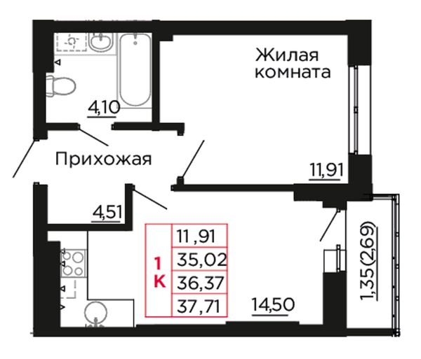 1-комнатная — 37,1 м²