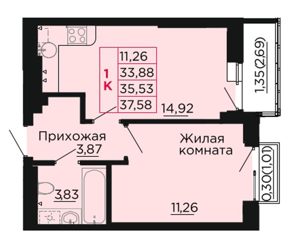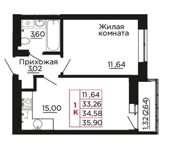 1-комнатная — 35,8 м²