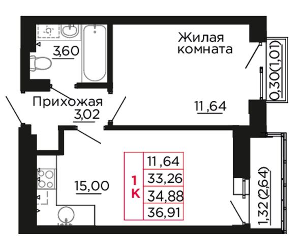 1-комнатная — 34,8 м²