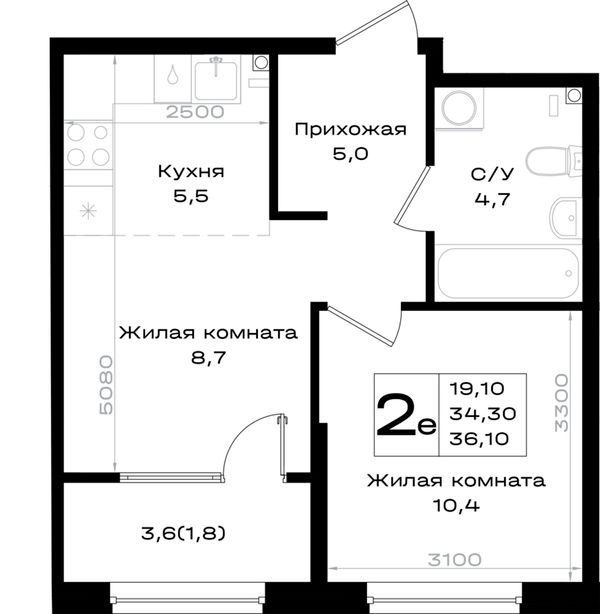 2-комнатная — 36,1 м²