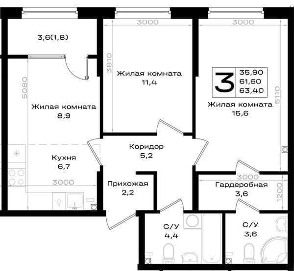 3-комнатная — 63,4 м²