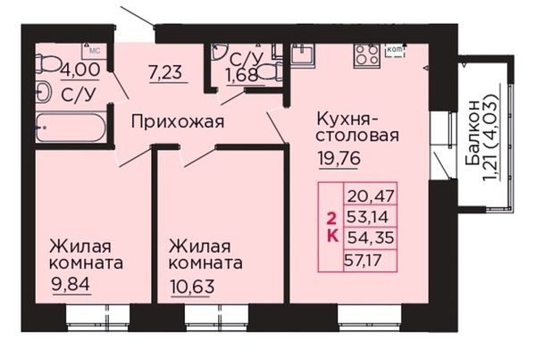 2-комнатная — 53,4 м²
