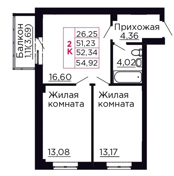 2-комнатная — 52,5 м²