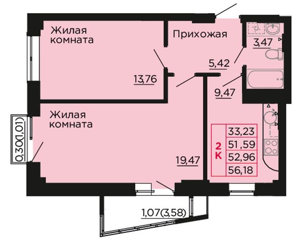 2-комнатная — 52,34 м²