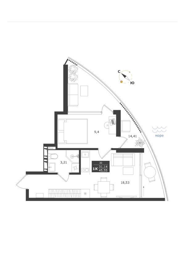 1-комнатная — 45,55 м²