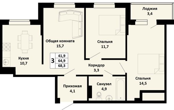 3-комнатная68,3 м²Краснодарский край, посёлок Южный, Северная улица, 42