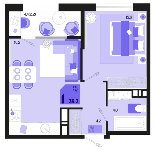 1-комнатная — 39,2 м²