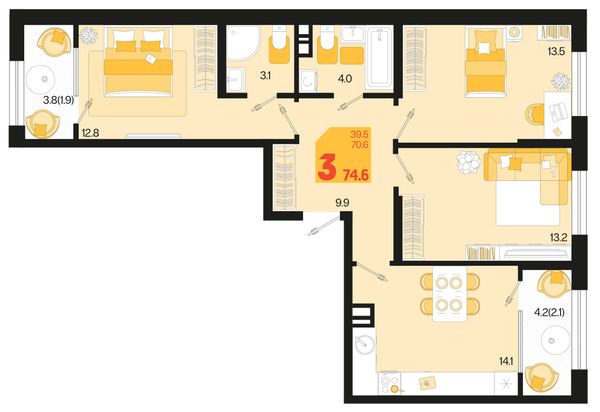 3-комнатная — 74,6 м²