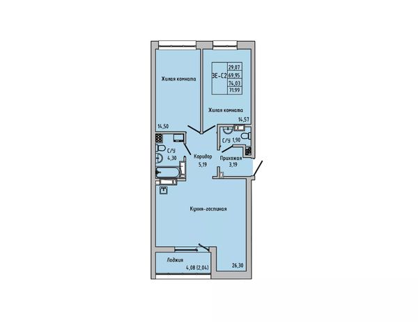 3-комнатная — 73,99 м²