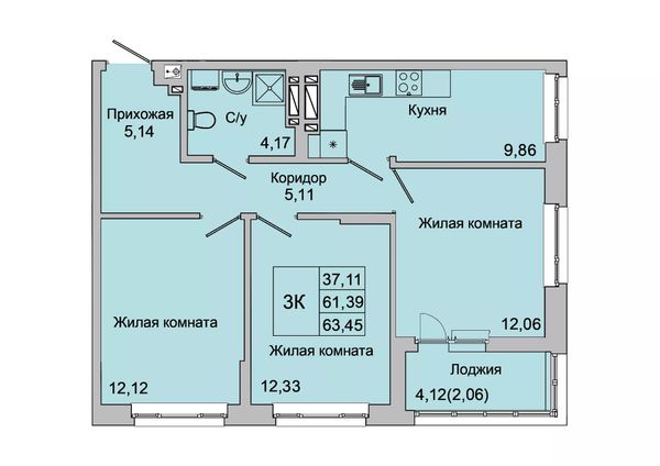 3-комнатная — 63,45 м²