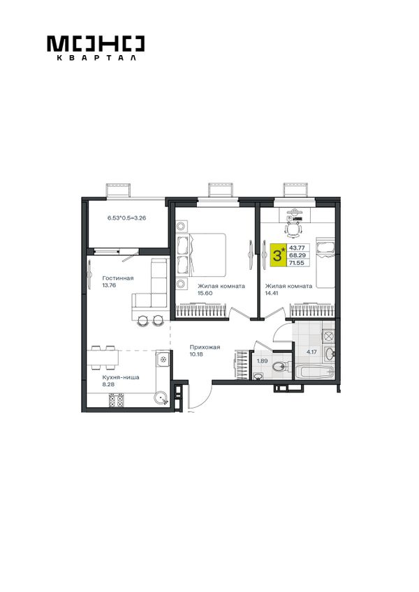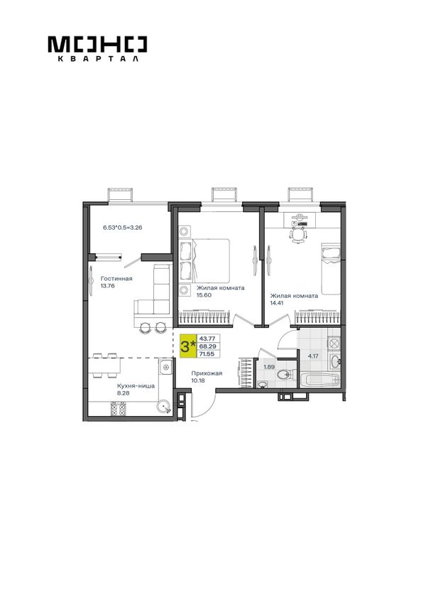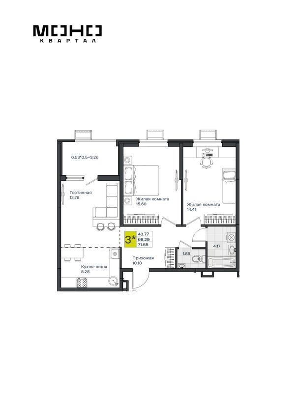 3-комнатная — 71,55 м²