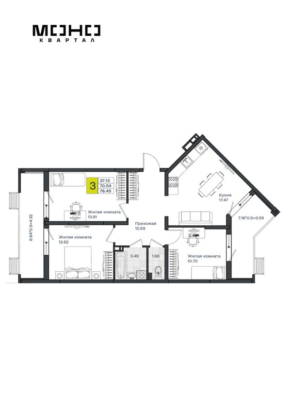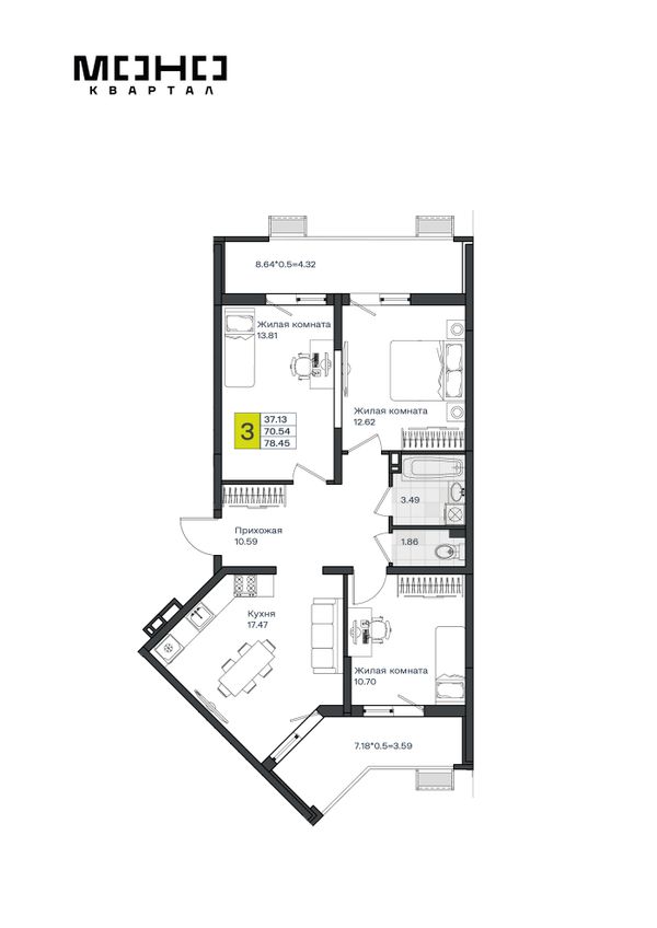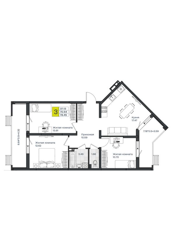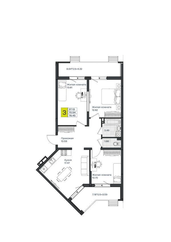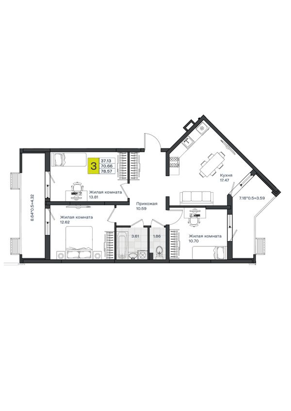 3-комнатная — 78,57 м²