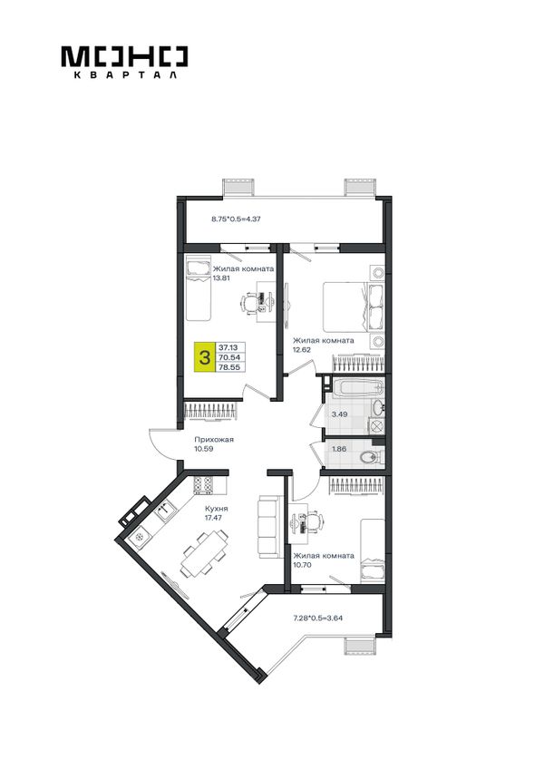 3-комнатная — 78,55 м²