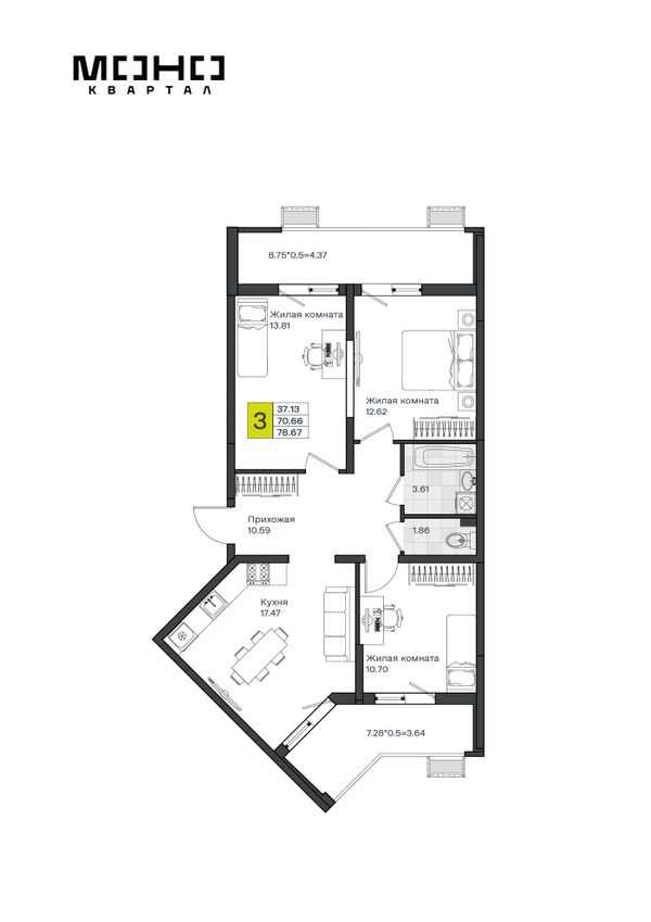 3-комнатная — 78,67 м²