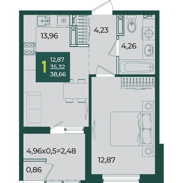 1-комнатная — 38,66 м²