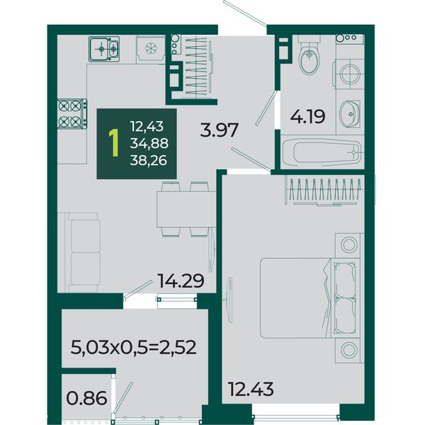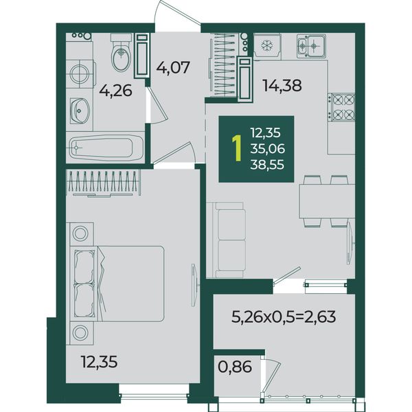 1-комнатная — 38,26 м²