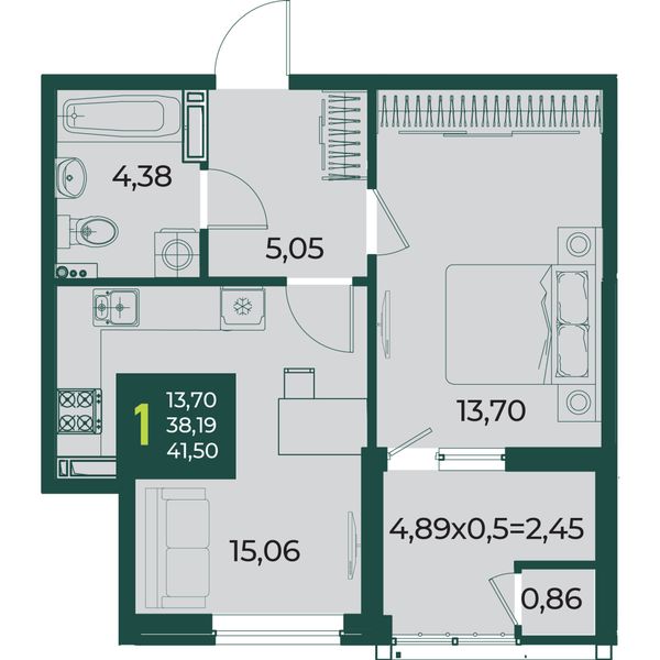1-комнатная — 38,79 м²