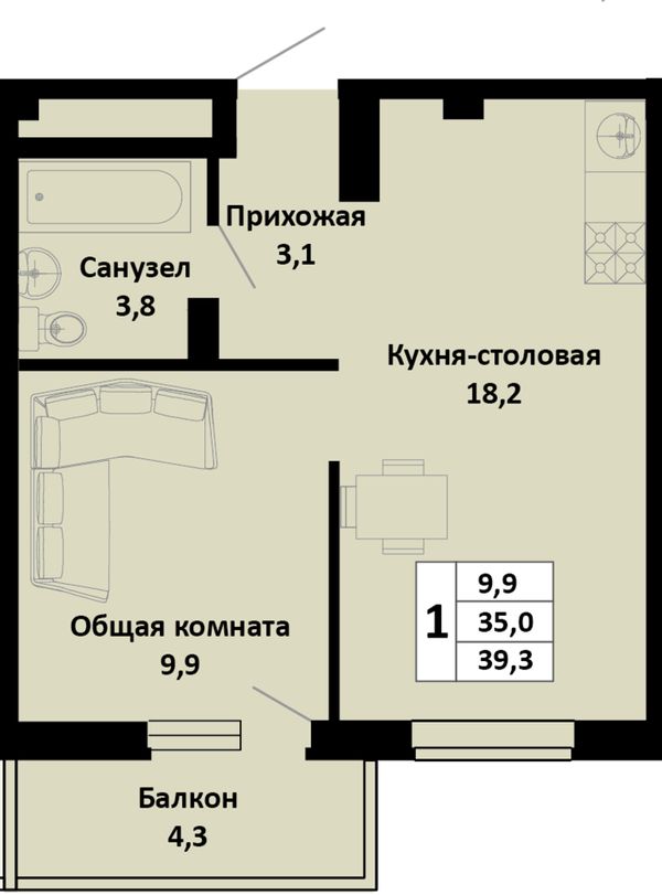 1-комнатная39,1 м²Краснодарский край, посёлок Южный, Северная улица, 42