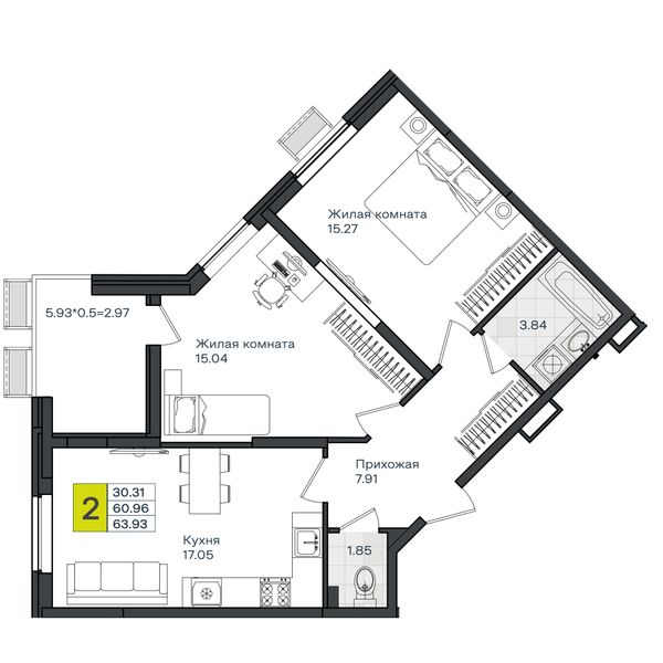 2-комнатная — 63,93 м²