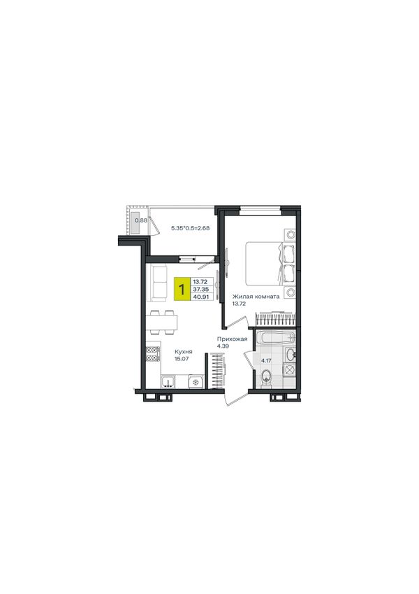1-комнатная — 40,91 м²