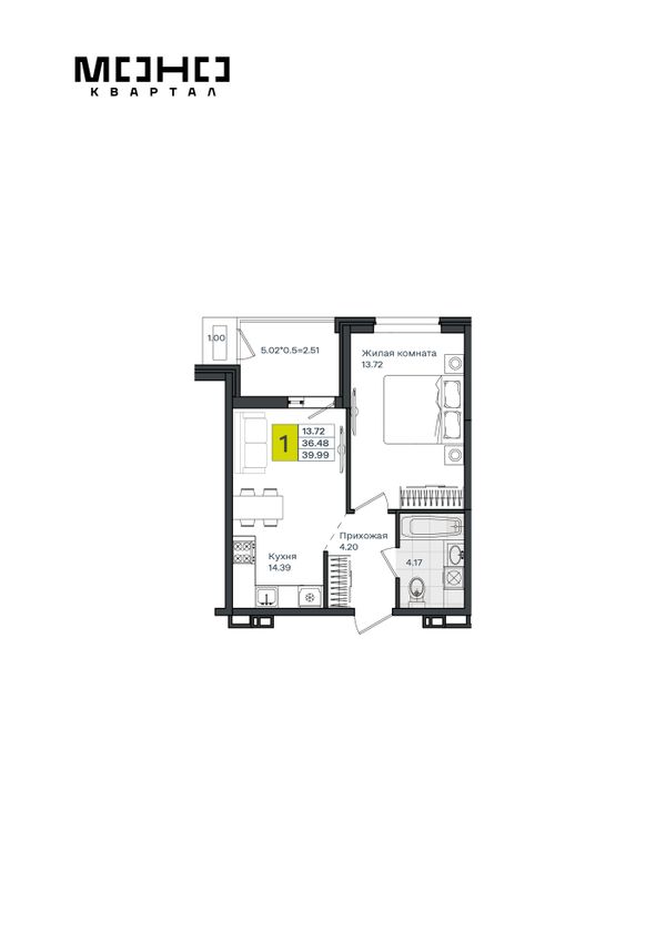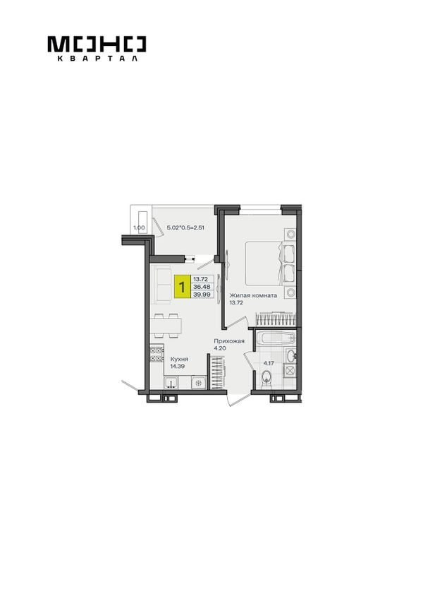 1-комнатная — 39,99 м²
