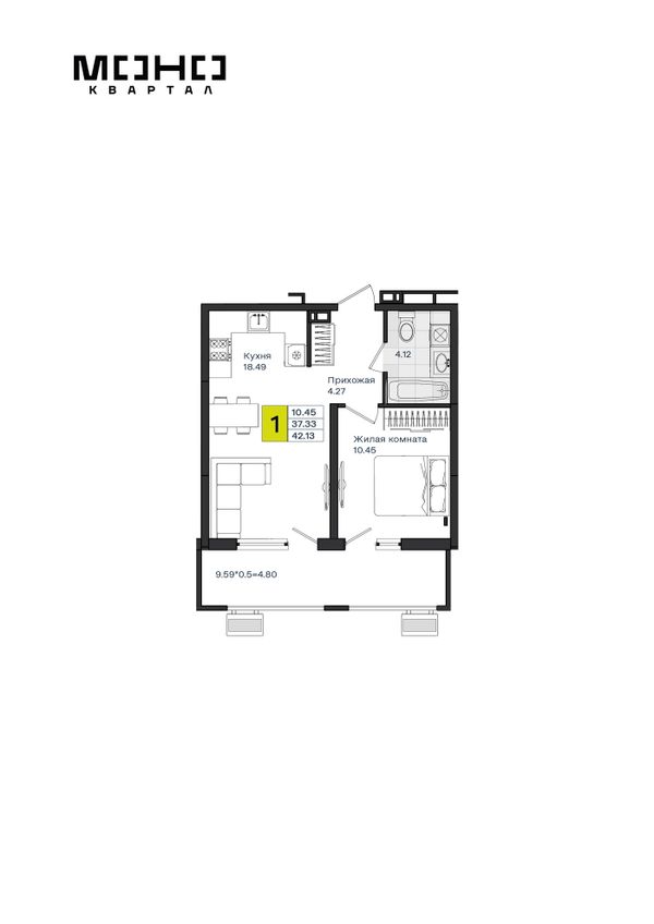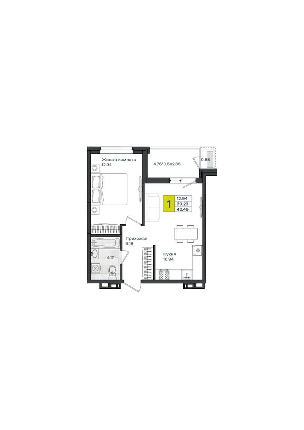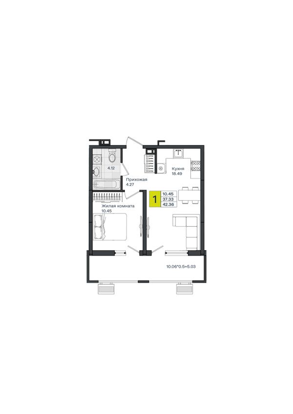1-комнатная — 42,49 м²