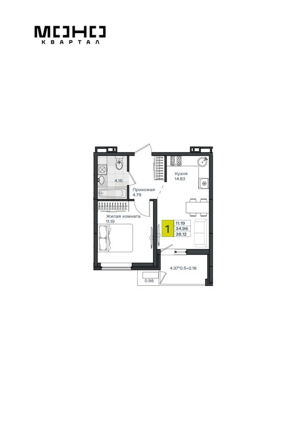 1-комнатная — 38,12 м²