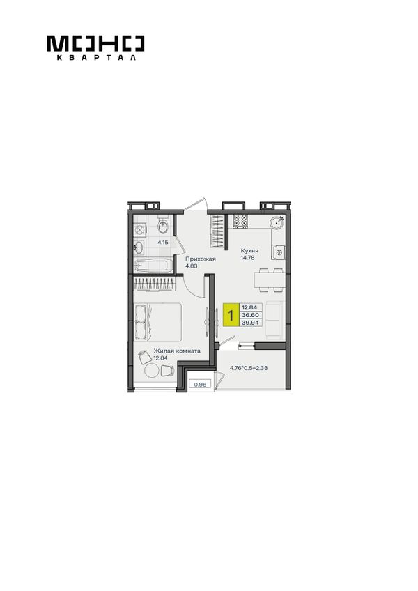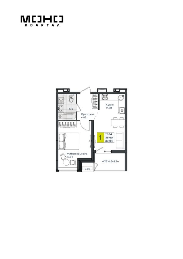 1-комнатная — 39,94 м²