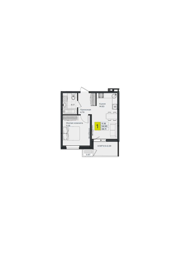 1-комнатная — 38,11 м²