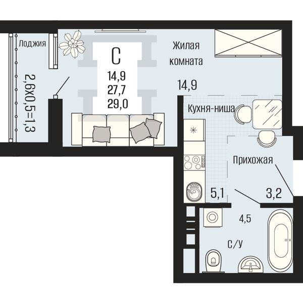 Студия — 29 м²