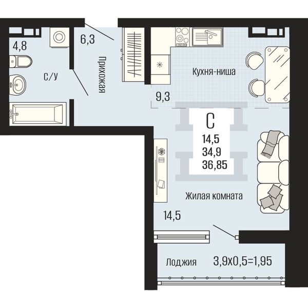 Студия — 36,85 м²