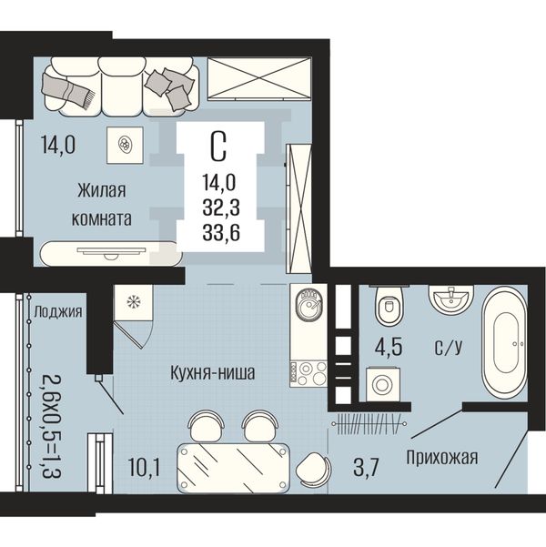 Студия — 32,3 м²