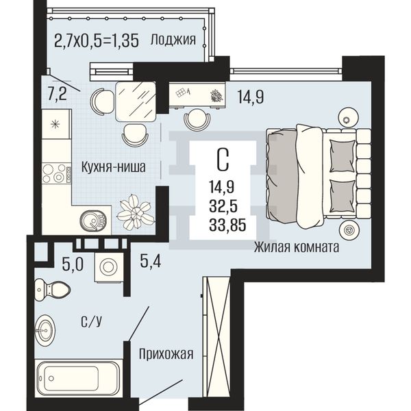 Студия — 33,85 м²