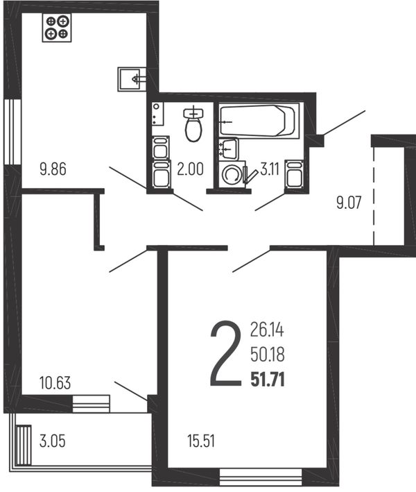 2-комнатная — 51,71 м²