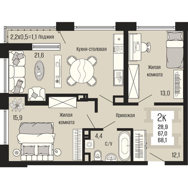 2-комнатная — 68,1 м²