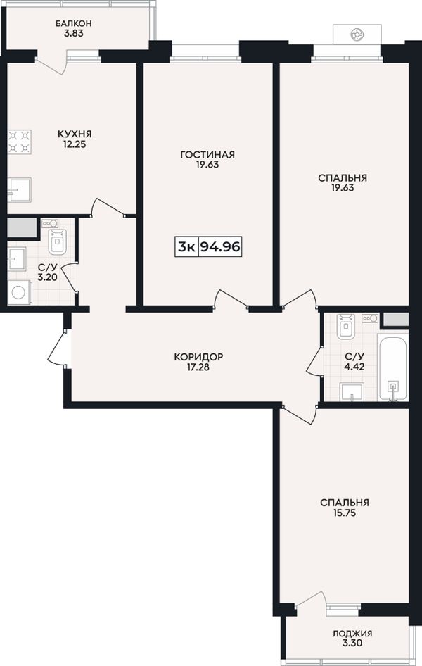 3-комнатная — 94,96 м²