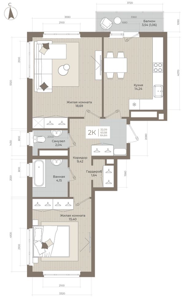 2-комнатная — 64,64 м²
