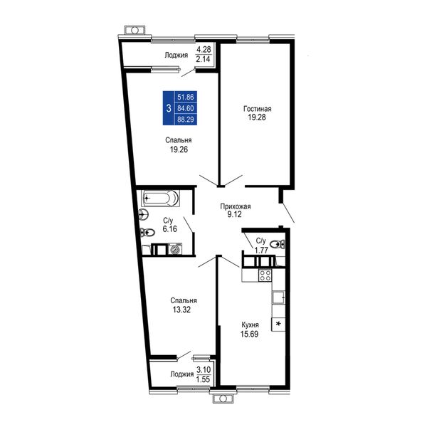 3-комнатная — 88,29 м²