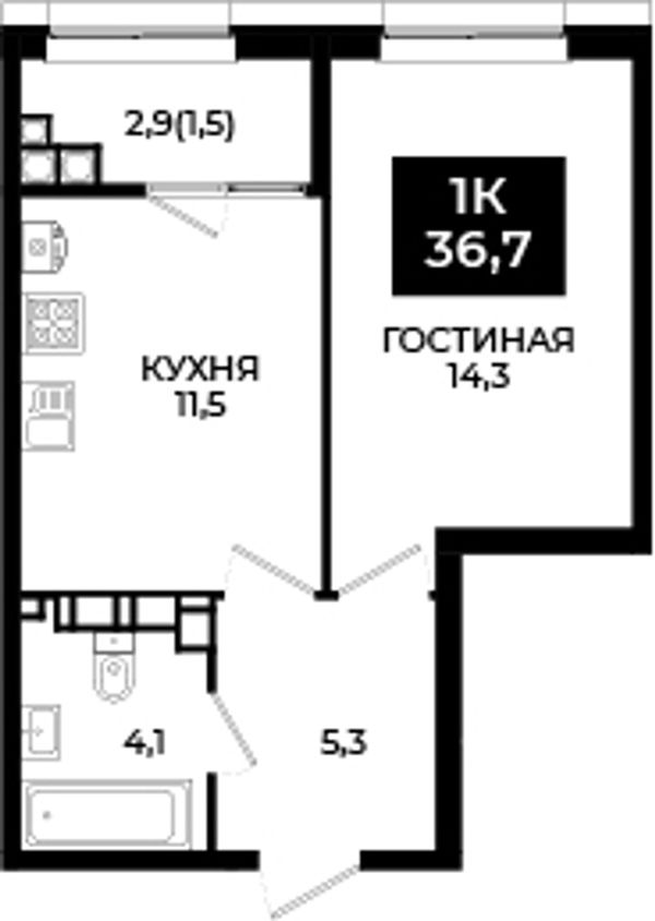 1-комнатная — 36,7 м²