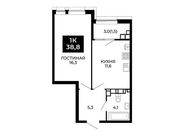 1-комнатная — 38,8 м²