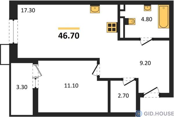 1-комнатная — 46,7 м²