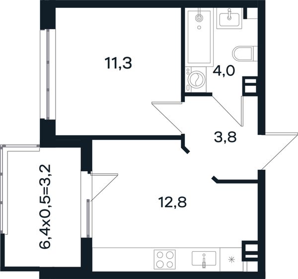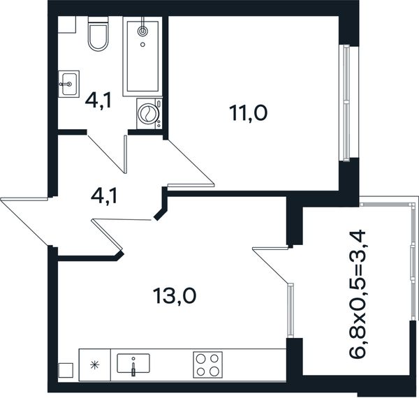 1-комнатная — 38,8 м²
