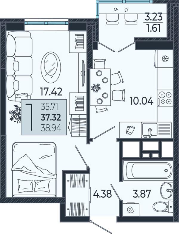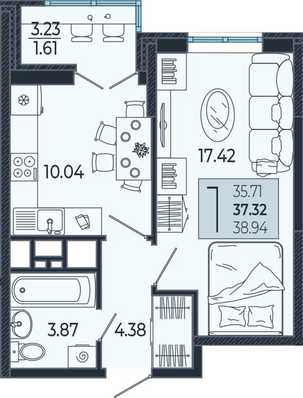 1-комнатная — 38,75 м²