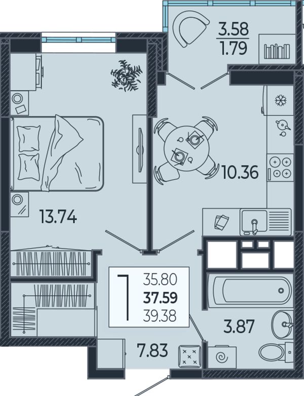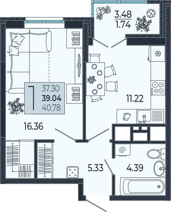 1-комнатная — 39,2 м²
