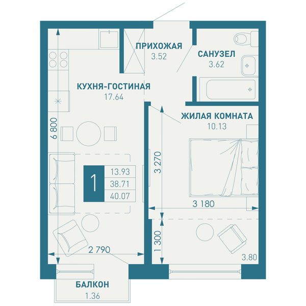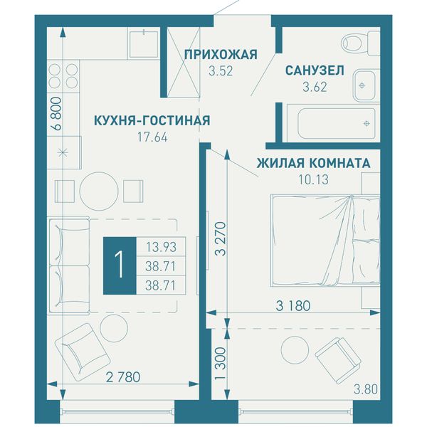 1-комнатная — 38,71 м²