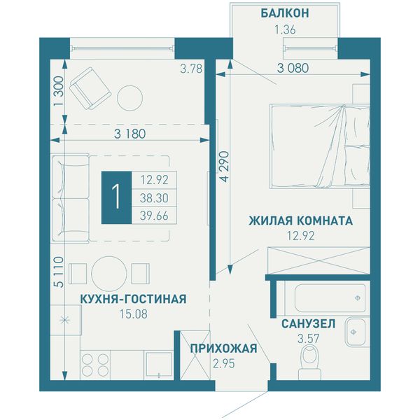 1-комнатная — 39,66 м²
