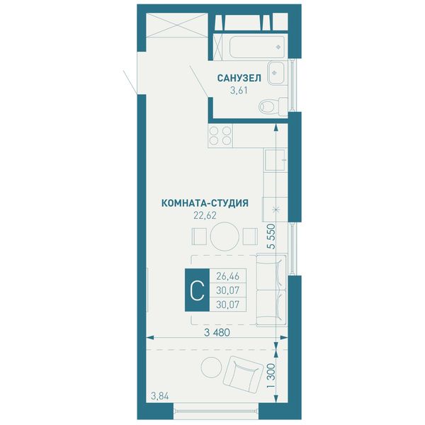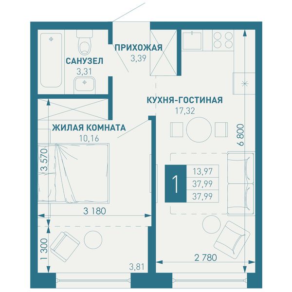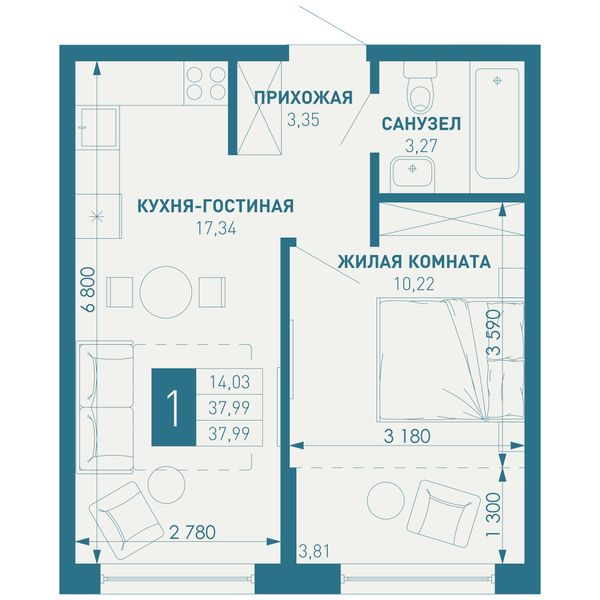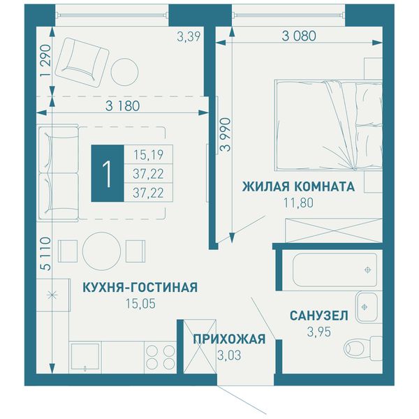 1-комнатная — 37,99 м²