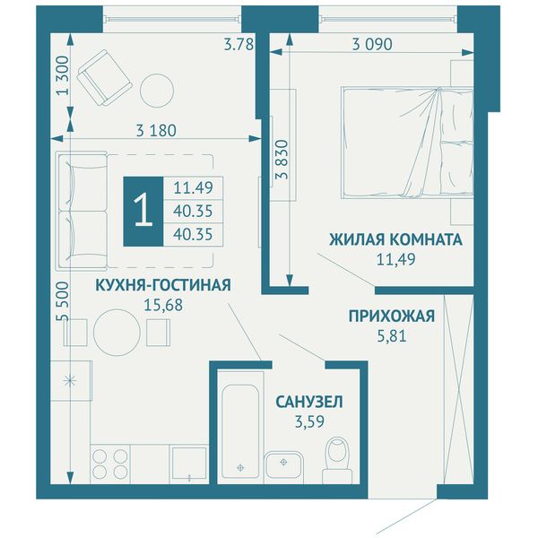 1-комнатная — 40,07 м²